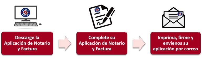 1. ImprimirAplicacióndeNotarioPúblicoylista/facturadeprecios.(Presione Aquí)2. Después de imprimir la aplicación, por favor llenar y firmar completamente la aplicación incluyendo la segunda sección de la aplicación que tiene como título “AFFIDAVIT OF CHARACTER” (Referencia personal Juramentada), esta sección debe ser llenada y firmada por una persona que certifique que conozca al solicitante por un año o más, puede ser un amigo o compañero de trabajo con la excepción de familiaresoparientes.3. Firmar y colocar la fecha en la página de juramentación de notario (Oath of Office) y en la página de la fianza (Bond).El Número de Seguro Social debe ser proporcionado obligatoriamente según lo indica en el Estatuto de la Florida, Subsección 111.91(2).Este es usado principalmente para obtener información acerca del historial criminal del solicitante.Envíe su aplicación original de Notario Público, el Certificado del Curso de Notario Público y factura con su pago correspondiente a la siguiente dirección:Aaron Notary Appointment Services, Inc.P.O. BOX 693002MIAMI FL 33269-3002Qué esperar después de enviar su solicitud de notario a Aaron Notary:•El tiempo de procesamiento normal toma aproximadamente 30 días hábiles, a menos que pague por el Servicio Rush, en el cual, el tiempo de procesamiento es de aproximadamente 15 días hábiles.•Una vez que su solicitud sea aprobada, le enviaremos notificaciones por correo electrónico. Por favor revisar su carpeta de spam.•Su sello notarial se le enviarán por separado por correo. •Su certificado oficial de notario se le enviará por correo.¿Qué sucede con mi fianza de $7,500?En el estado de Florida, la fianza comprados através de Aaron Notary Appointment Services Inc. se procesan y luego se envían al Departamento de Estado, División notarial. La fianza nunca se le envía directamente al aplicante. La fianza se entrega al estado de la Florida una vez que usted nos envió su solicitud completa, ya que el formulario de fianza es parte de la solicitud de Notario de Florida, es requerido y mantenido por el Estado de Florida, de acuerdo a la ley de la Florida, Capítulo 117.01(7)(a)(c). Para obtener una copia de la fianza HAGA CLIC AQUÍ.Para obtener una copia de su Certificado de Comisión Notarial HAGA CLIC AQUÍ.